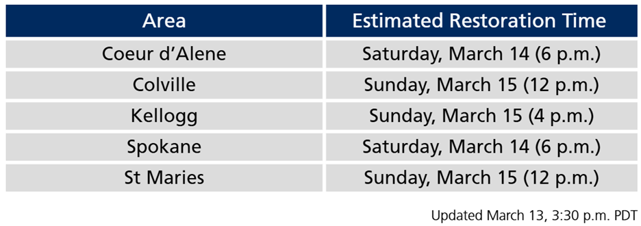 Spokane, Wash. March. 13, 2026, 5 p.m.: Avista crews have restored power to about 93% of customers originally impacted by Wednesday’s windstorm. Avista is focused on complex repairs—many in harder-to-reach areas that take longer to rebuild.